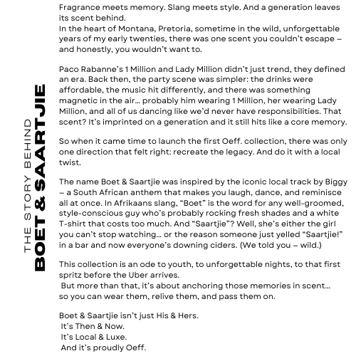 Inspired by Paco Rabanne’s 1 Million, Boet is a fragrance for the man who walks into a room and owns it effortlessly. It opens with a burst of fresh grapefruit and spice, settles into warm cinnamon and leather, and finishes with a smooth, refined masculine presence.